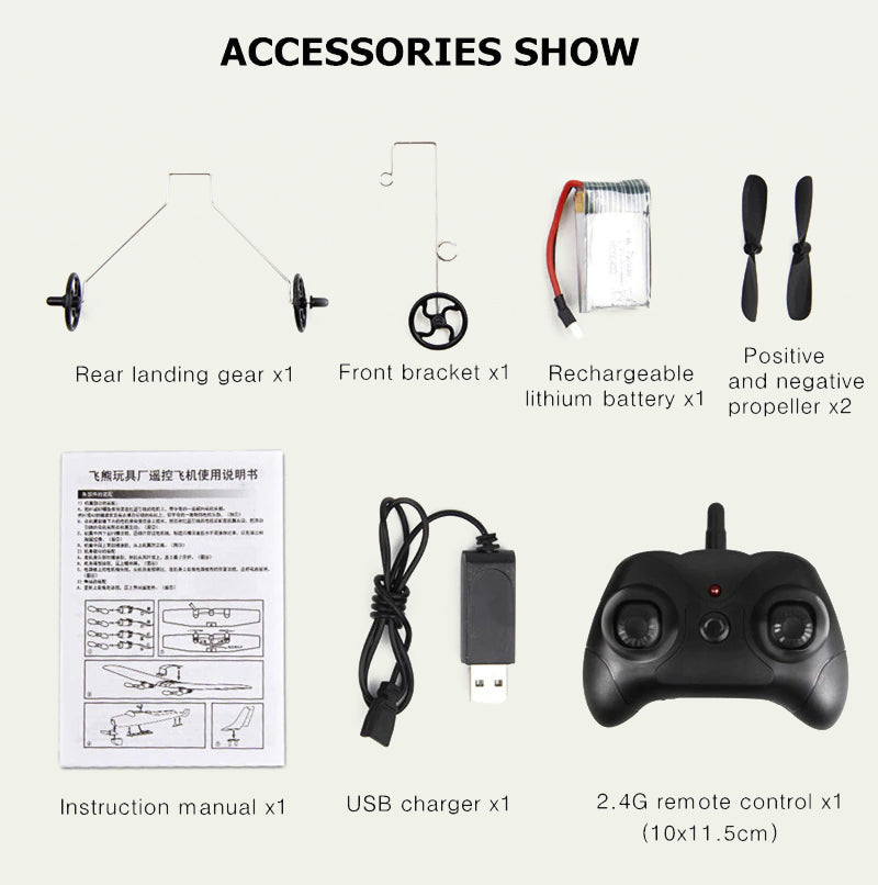 - Package size:18.8*12.99*3.1in package include:1*RC Plane;1*batteries;1*remote controller;1*USB charger;1*Propeller & Landing gear.